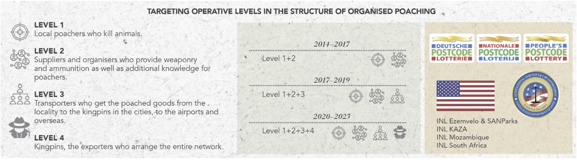 From the Rhino Protection Programme, several impactful interventions and innovative approaches have emerged, including the South African Integrated Wildlife Zones initiative funded by the U.S. Department of State International Bureau of Narcotics and Law Enforcement Affairs (INL). In this ongoing project, seven integrated zones have been established, demarcating key rhino populations within both state and privately owned protected areas. This zonal model bypasses limitations imposed by boundaries and facilitates unprecedented cooperation leading to more effective conservation efforts.