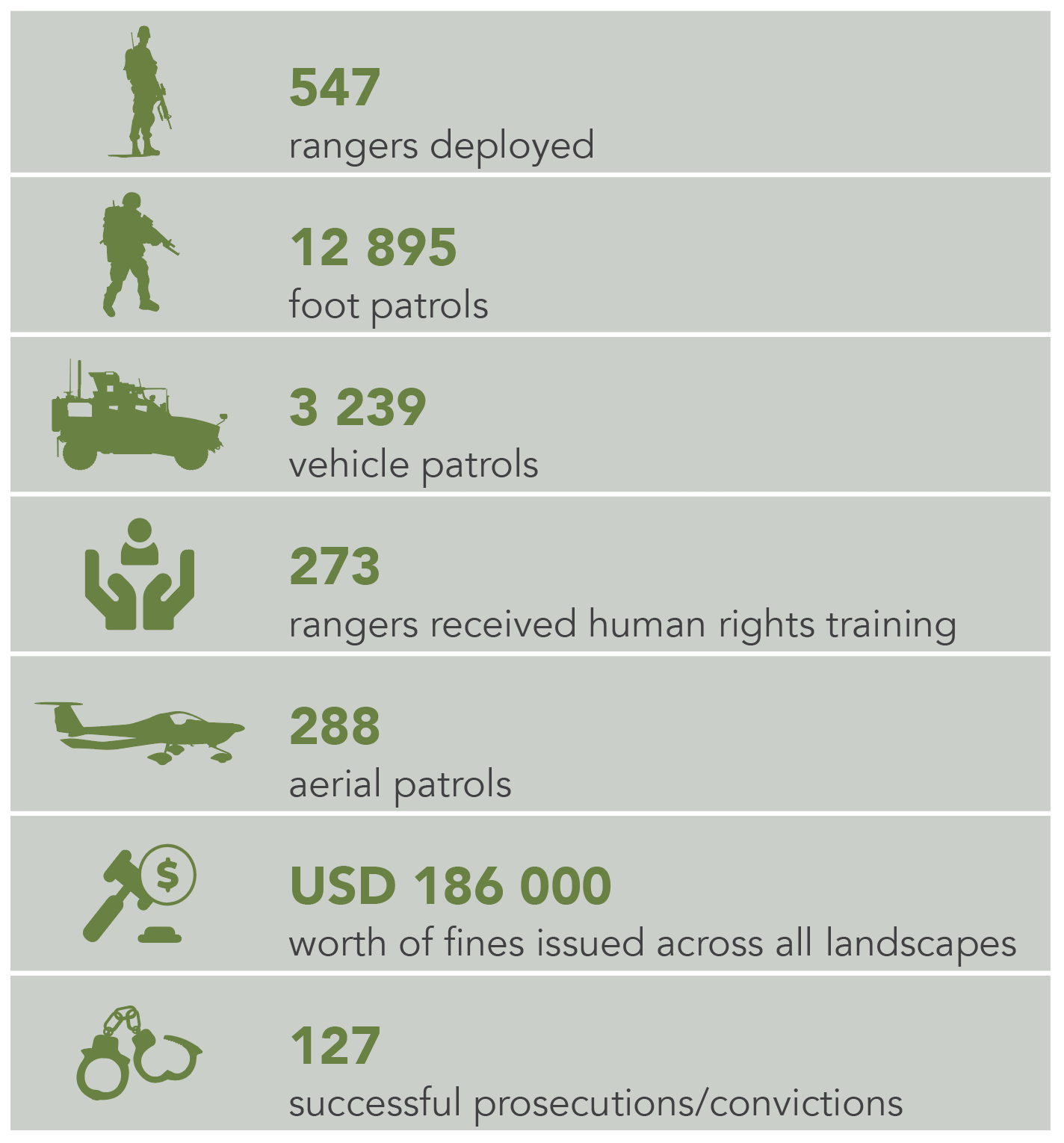 Over 1 000 rangers trained in South Africa, two Savanna aircraft deployed, over 50 rhino orphans saved, ranger houses built, rangers equipped, basic surveillance and access control introduced.