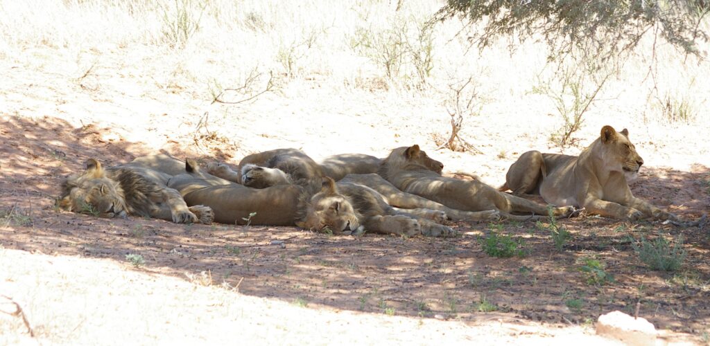 A pride of lions rests in the shade of a tree. They can often be seen strolling through the park’s unfenced camps. ©Peace Parks Foundation