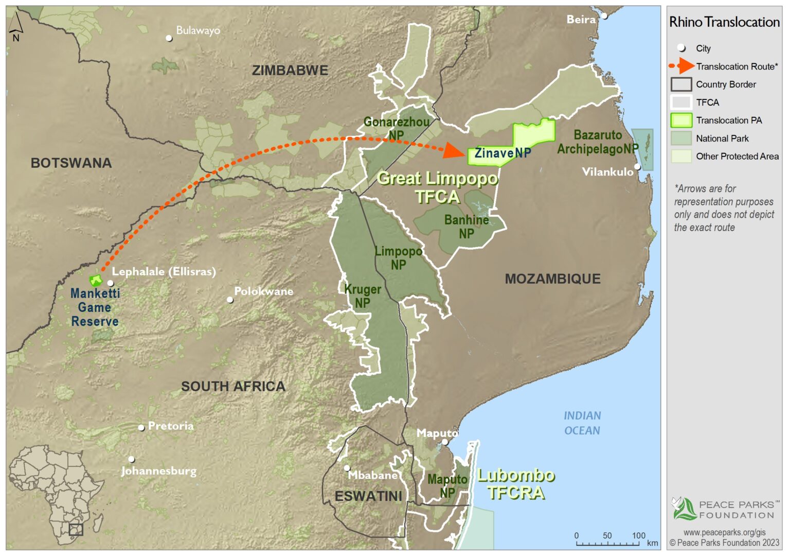The ambitious operation, the third following last year’s pioneering cross-border rhino translocations, is the result of a collaborative partnership between Mozambique’s National Administration for Conservation Areas (ANAC), Peace Parks Foundation, and Exxaro Resources, with the support of the Government of South Africa. Exxaro generously donated the rhinos and have made a substantial contribution to the park’s operational costs, with additional funding provided by Anglo American, the De Beers Group, Geos Foundation, German Postcode Lottery, the MAVA Foundation and private donors.