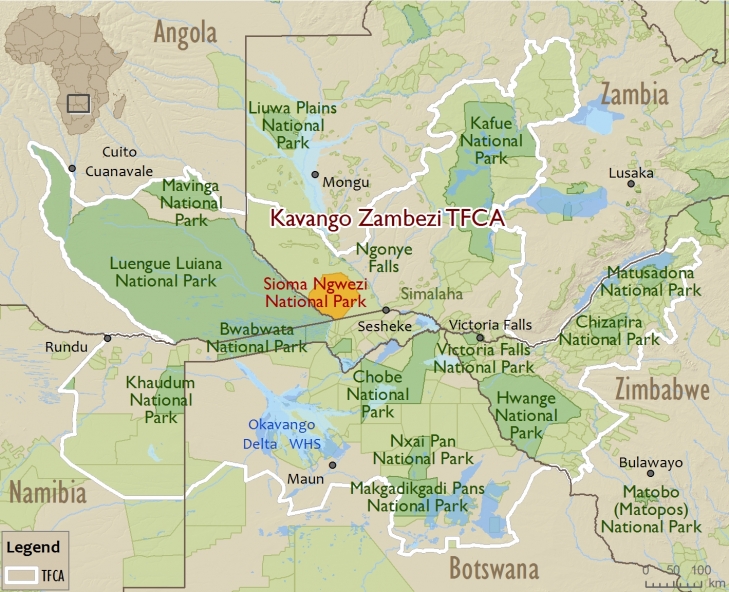 Situated in south-western Zambia, Sioma Ngwezi National Park is strategically positioned on the borders of Zambia with Namibia and Angola. While the park now forms part of the national conservation estate of Zambia, it was previously part of the traditional conservation estate of the Barotse Royal Establishment, reflecting the value that traditional African societies place on areas with significant wildlife. Wedged between the Luiana Partial Reserve in Angola and the Bwabwata National Park in Namibia, the park plays an essential ecological role for wildlife movement along the Kwando and Zambezi rivers despite it not extending all the way to the Zambezi River. The park and the surrounding area within the West Zambezi Game Management Area have therefore been earmarked for intensive wildlife recovery.