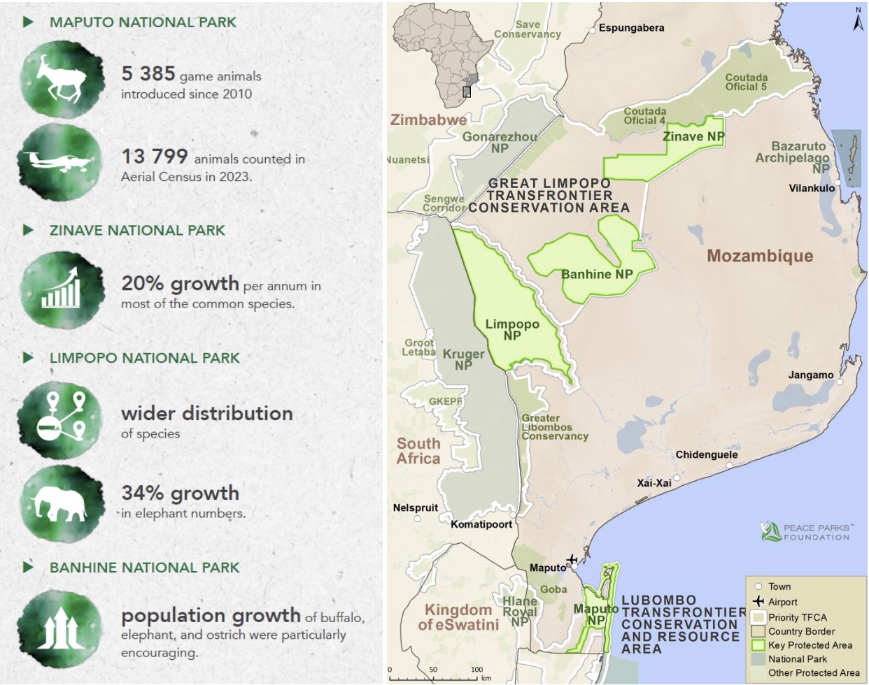 The restoration of Banhine is just beginning and the first translocations are scheduled for 2025. In the first-ever census there, populations of buffalo, elephant, and ostrich were particularly encouraging.