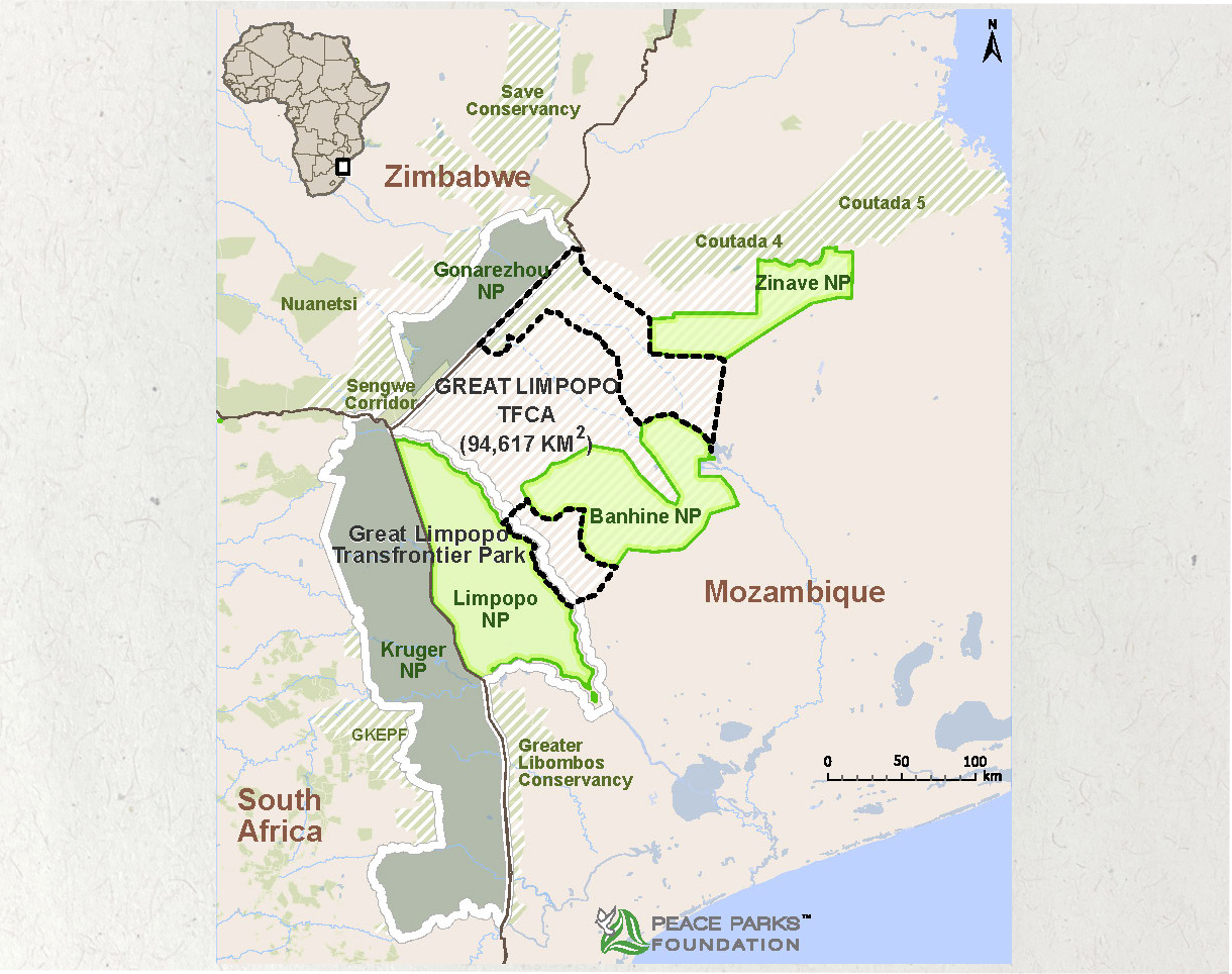 The larger Great Limpopo Transfrontier Conservation area (TFCA), measuring almost 100 000 km², includes the Banhine and Zinave National Parks, the Massingir and Corumana areas and interlinking regions in Mozambique, as well as various privately and state-owned conservation areas in South Africa and Zimbabwe bordering on the transfrontier park.